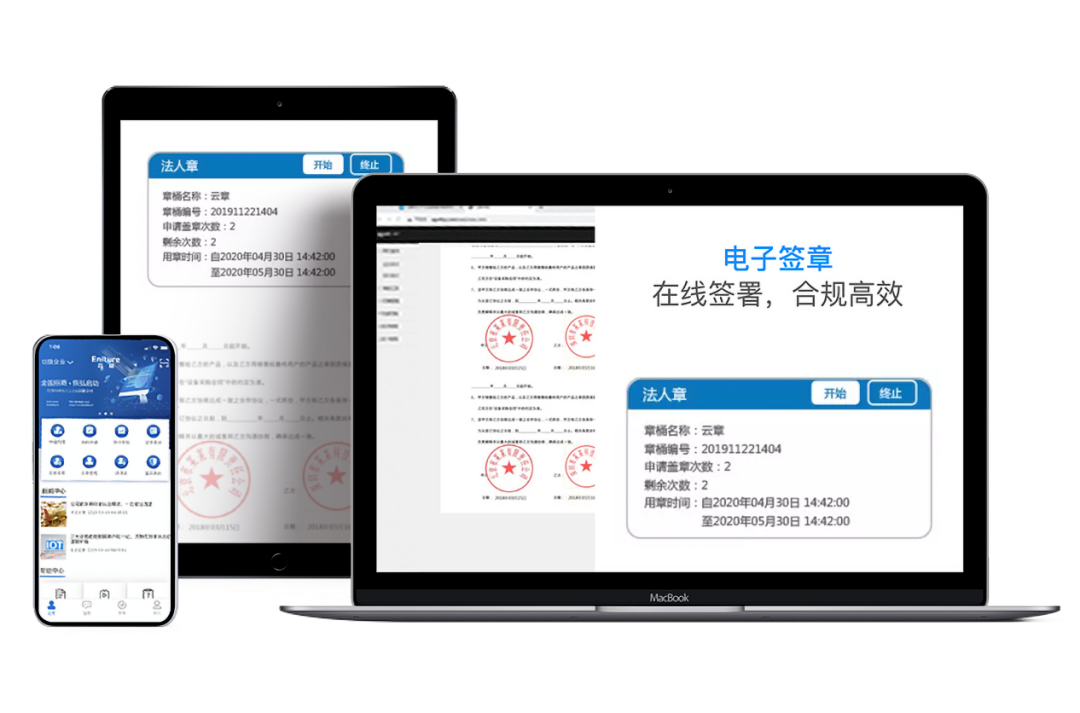 電子合同編輯完成后,用戶即可在線發起電子合同簽署,簽約方實名認證并使用電子簽章進行簽署,一份電子合同就簽署完成了。
